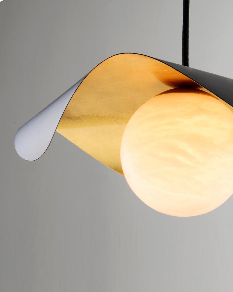 LOTOS porta una presenza scultorea e poetica negli spazi interni attraverso la sua sfera naturale in alabastro abbinata a una raffinata struttura in ferro. Ispirato alle forme celesti, il design bilancia la pietra morbida con il metallo strutturato, creando una lampada a sospensione che appare elegante e architettonica.