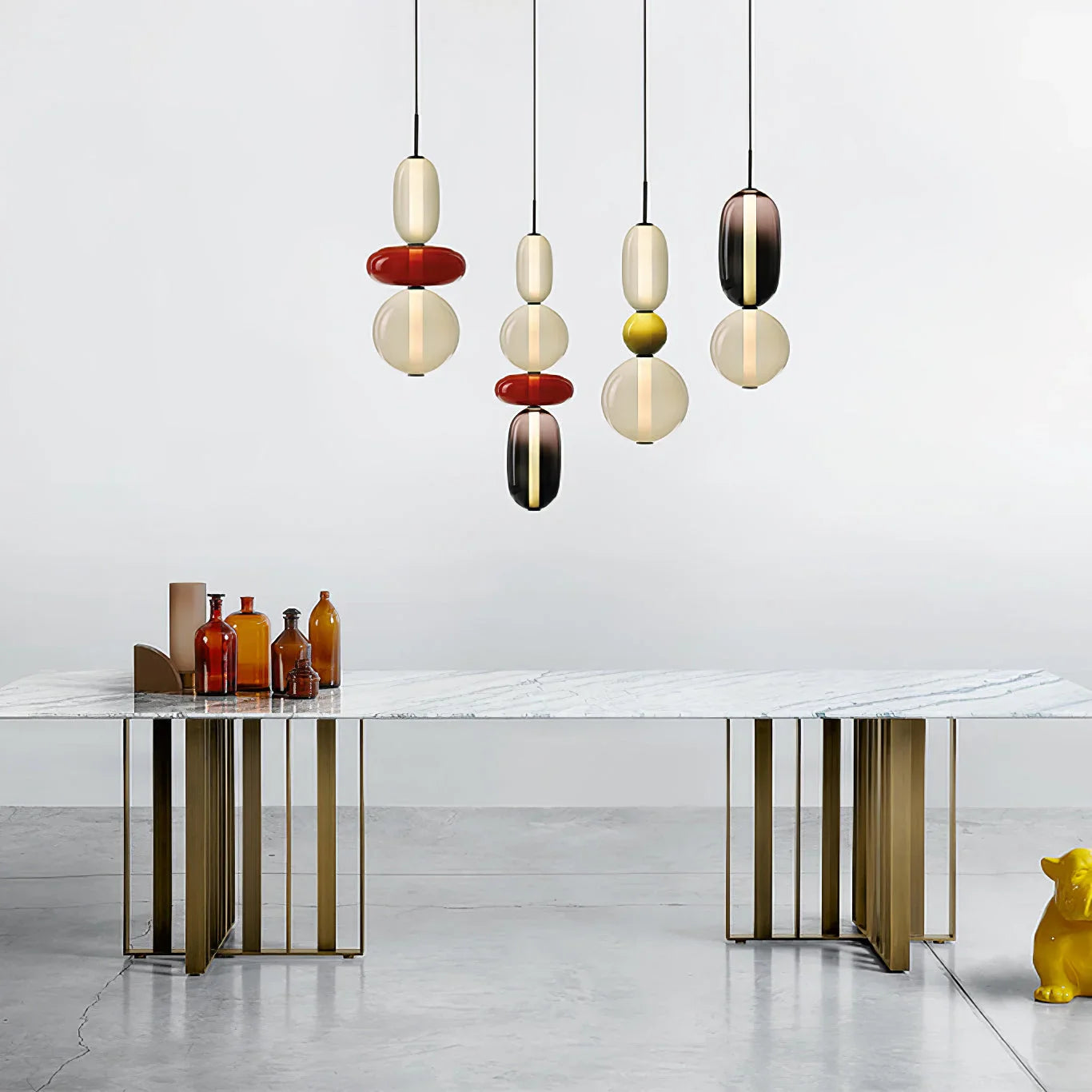 COSMOS porta un'eleganza giocosa negli spazi interni attraverso la sua composizione scultorea di forme in vetro candito colorato sospese in perfetto equilibrio. Progettata come un pezzo d'affermazione moderno, questa lampada a sospensione trasforma la luce in un'esperienza visiva, creando profondità, movimento e atmosfera all'interno della stanza.