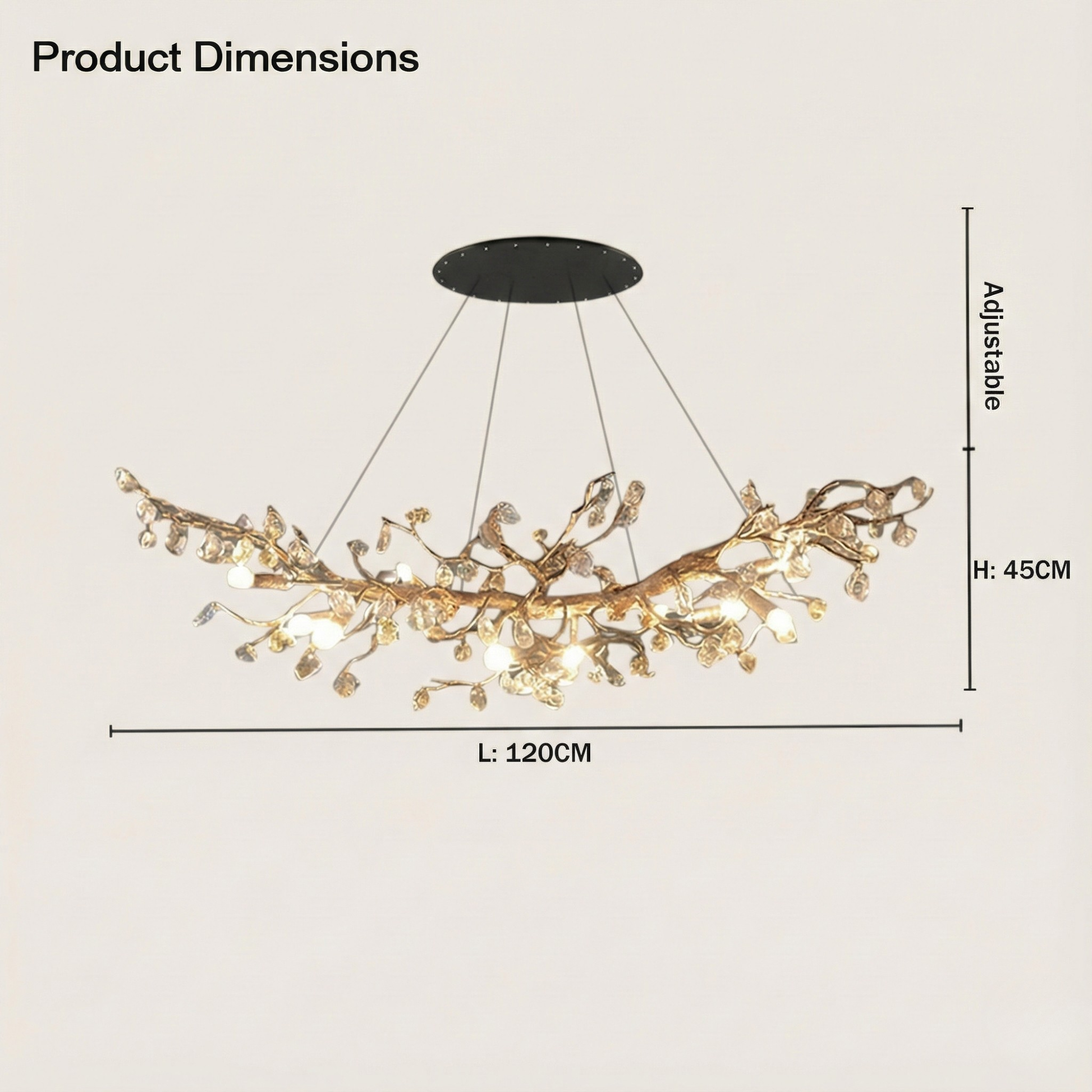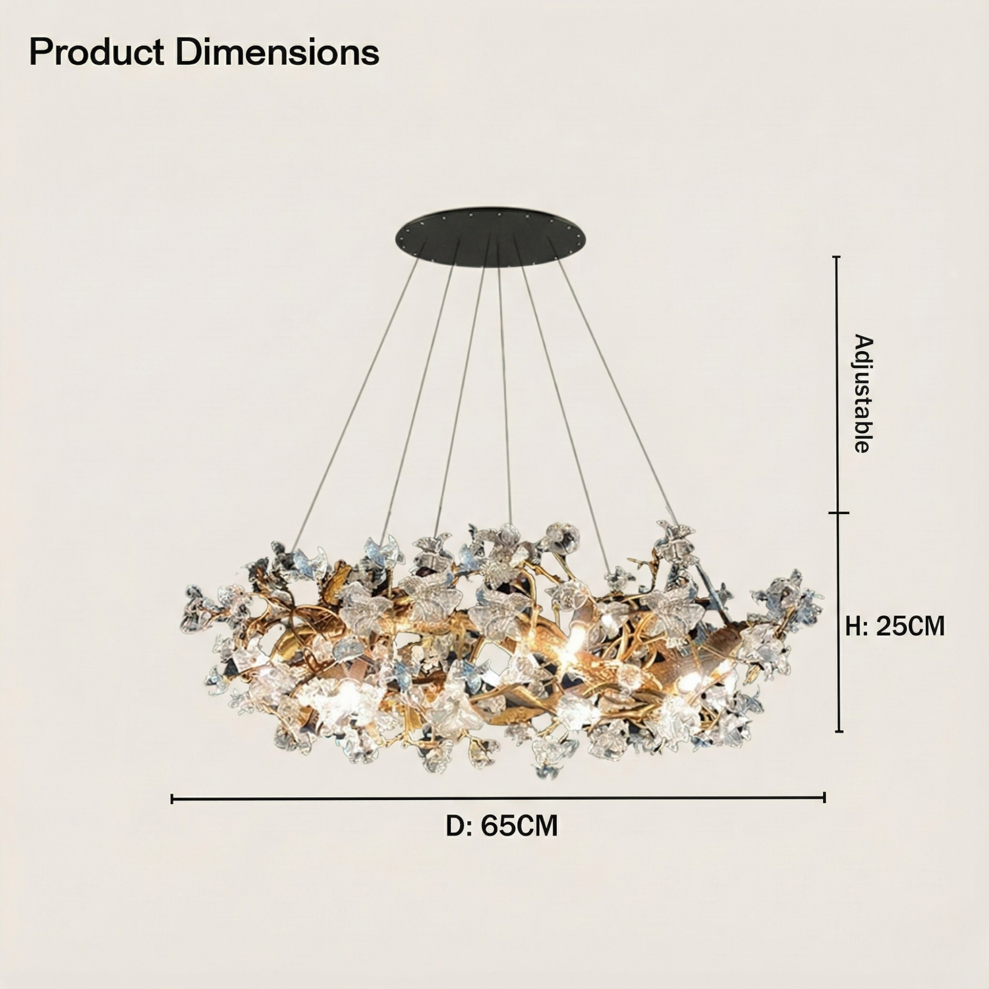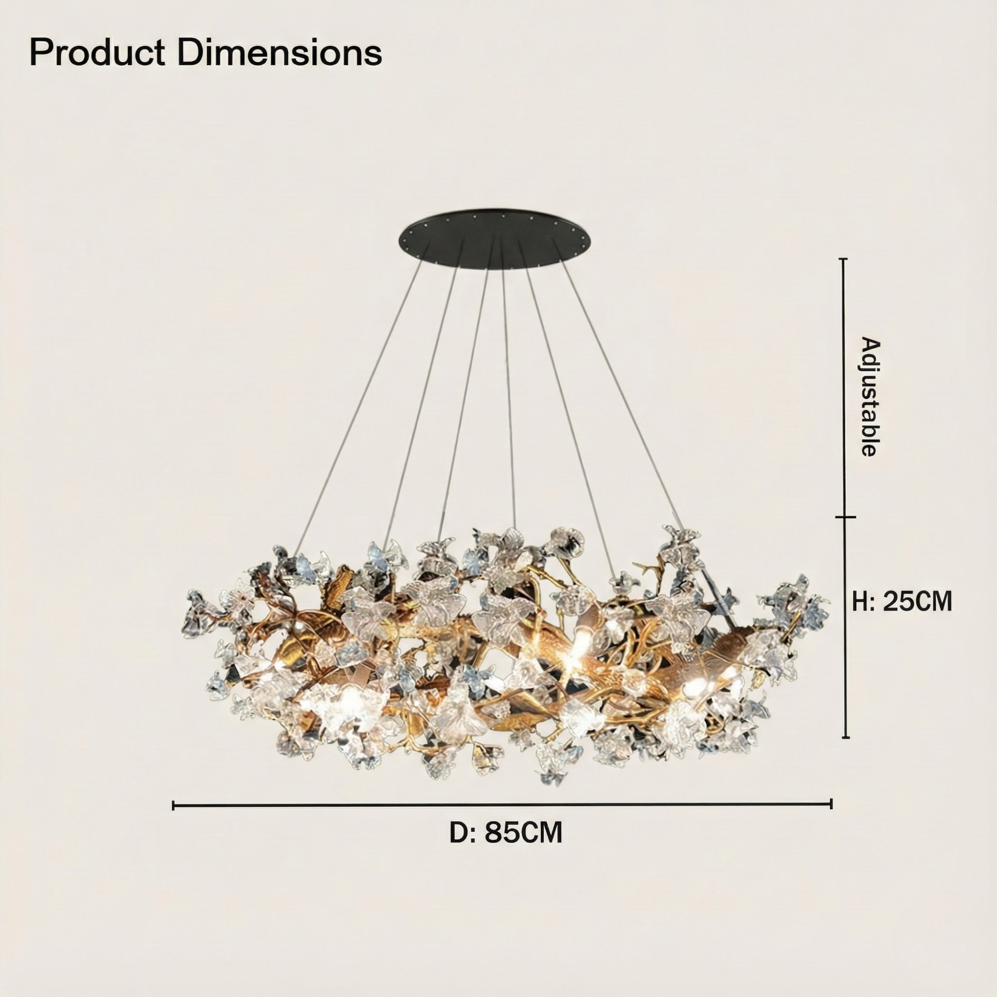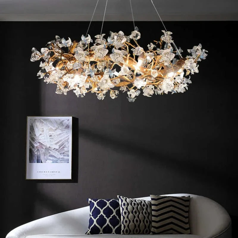 Handcrafted with precision, BILOBA diffuses light beautifully through its transparent glass elements, producing a clean yet atmospheric glow. The floral arrangement adds visual softness while maintaining architectural clarity, making the chandelier feel elegant without excess.