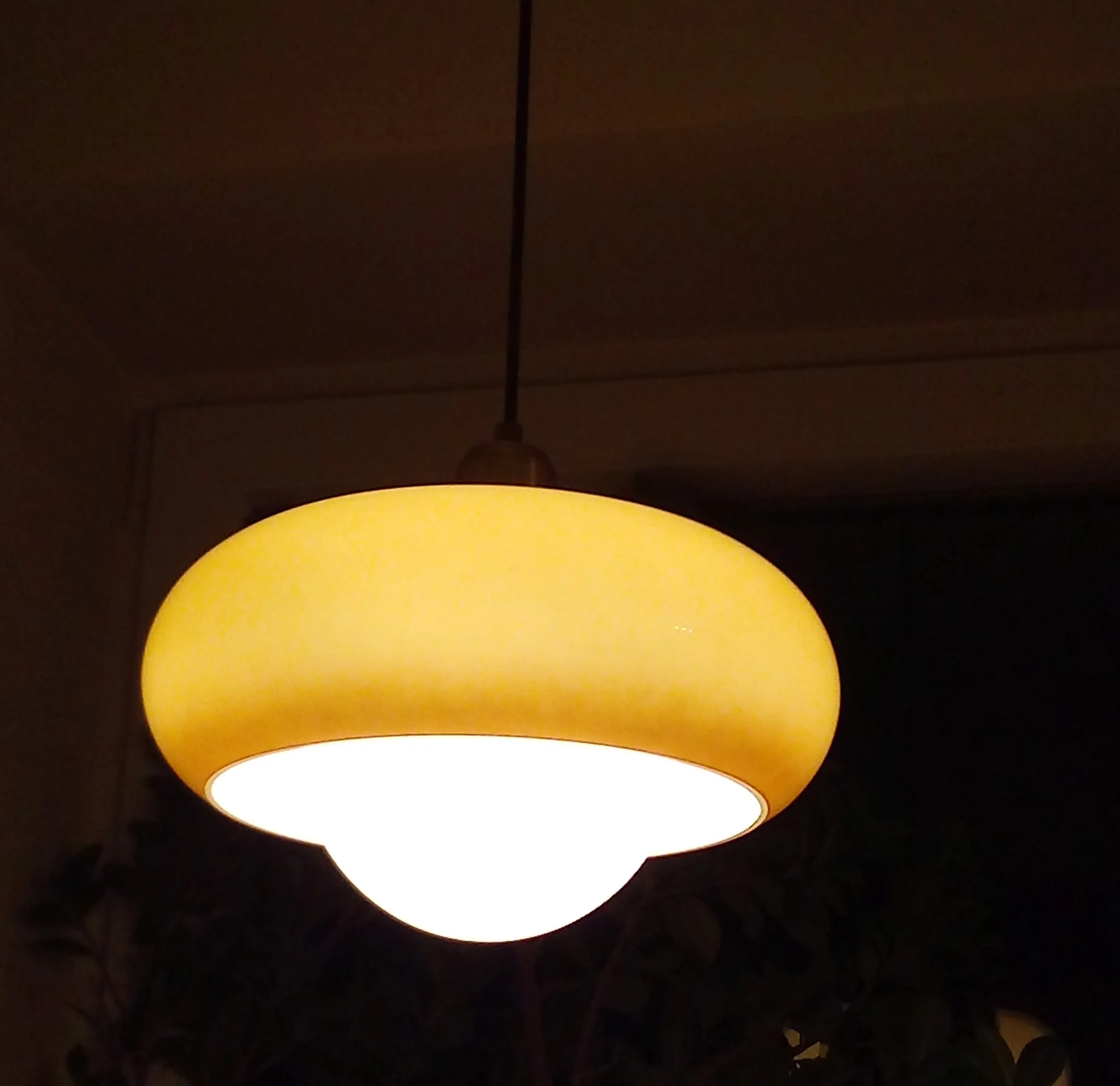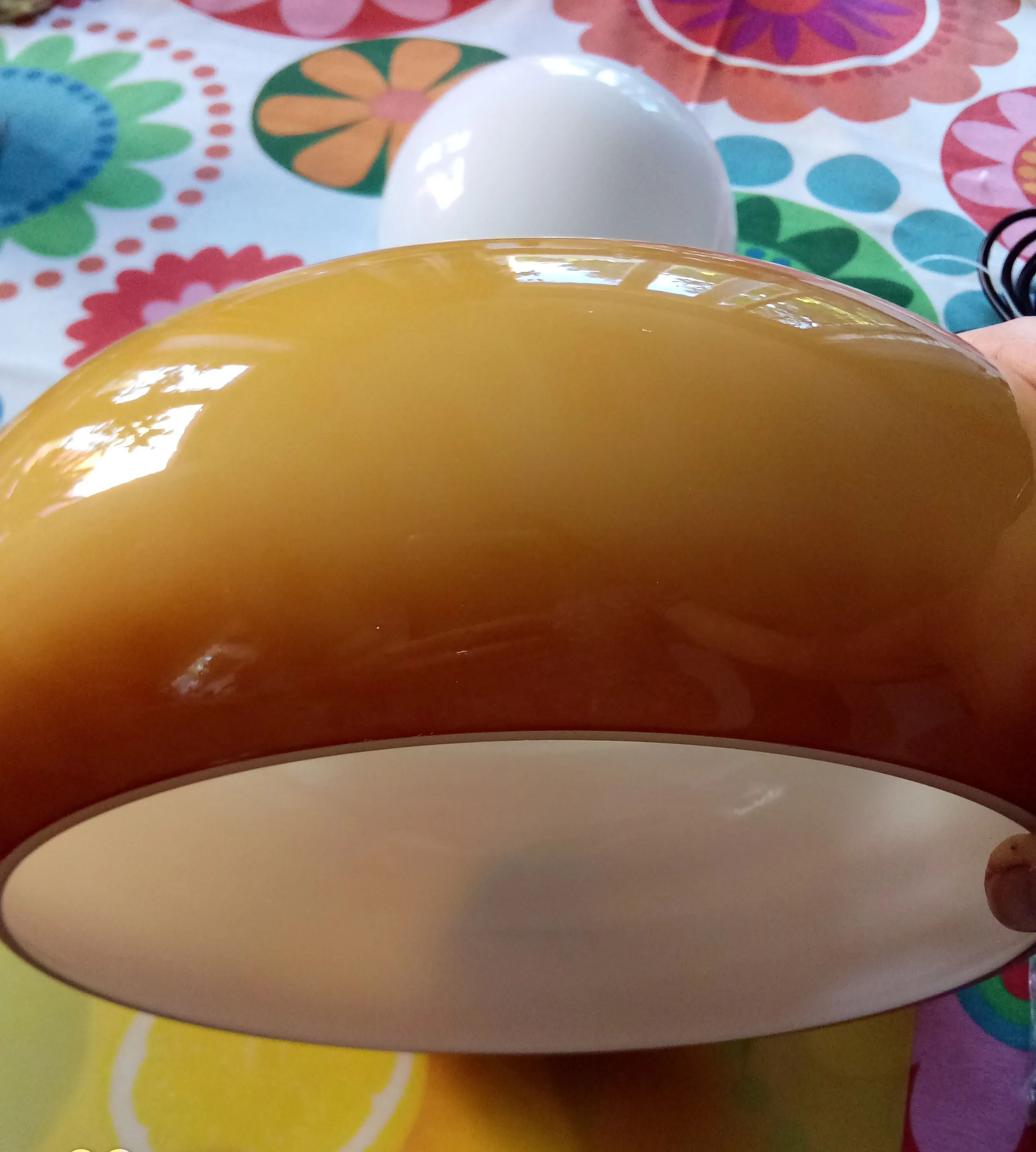 The color of the lamp is beige-brown, not orange. The lamp is difficult to level. The bigger glass is nice, the white sphere has shadows visible when the light is turned on, but... it is not a murano....the golden metal elements are nice and lamp is well packaged, nothing was broken. I'll have to paint the inside of the lamp somehow to get an orange, warm light on the ceiling, but overall, i'm happy with the cost.